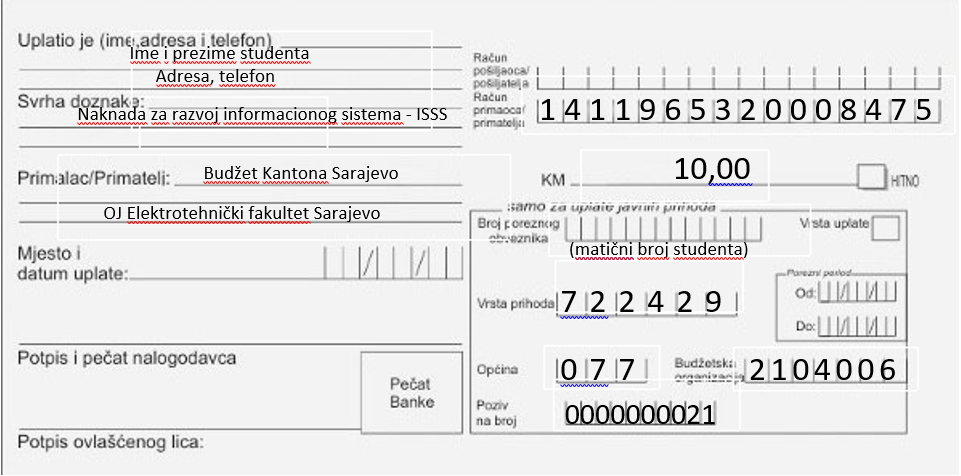 6. Dokaz o uplati u iznosu od 10,00 KM za razvoj Informacionog sistema Studentske službe/UNSA (primjer uplatnice u prilogu obavještenja).