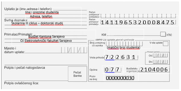 Za upis u odgovarajuću godinu (obnova ili upis više godine) trećeg ciklusa studija na Elektrotehničkom fakultetu u Sarajevu u studijskoj 2019/2020. godini potrebno je predati sljedeće dokumente: